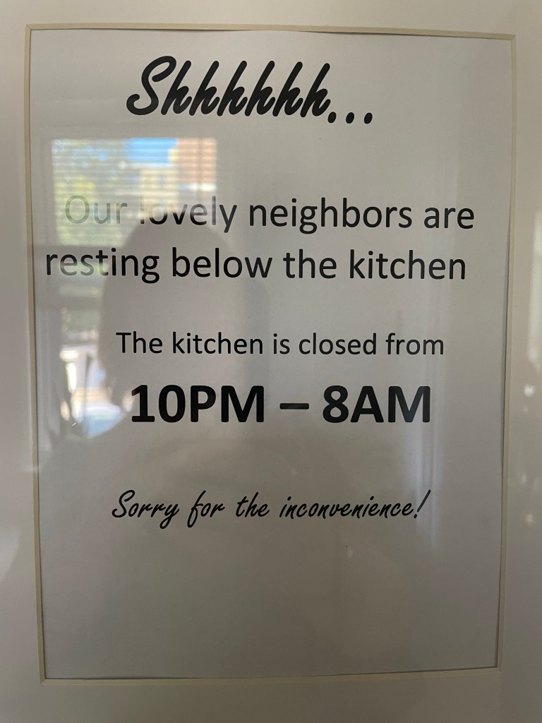 The place I am staying is a lovely old home. Basically a boarding house. It has so many passive aggressive signs in every space reminding me how to to live like a human with basic grooming skills that I want to have a wild party and smear things on the walls. I haven’t so far.